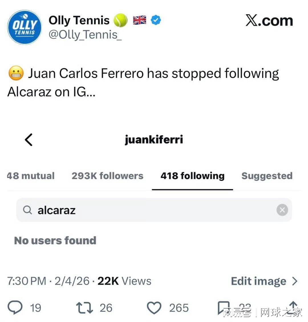 昨天,有网友注意到费雷罗已在Instagram上取关了他曾经的爱徒阿尔卡拉斯,这对备受瞩目的师徒彻底分道扬镳,走向了故事里最令人唏嘘的章节。它不再仅仅是网球圈内一则寻常的流动新闻,而是一场被置于聚光灯下的、体面与拉扯交织的漫长告别。职业网坛教练与球员间的聚散离合本如季节更替般寻常,但只因主角是那个来自穆尔西亚、被费雷罗亲手从璞玉雕琢成王者的阿尔卡拉斯,一切便有了不同的重量。如今,阿卡在墨尔本公园捧起澳网冠军奖杯,完成了全满贯的伟业,脸上的笑容是灿烂的。而他的成长之路上,那个最熟悉的身影已不在场边。这辉煌的胜利,被许多人解读为一个无声的“独立宣言”,背后却是一个关乎成长、权力与最终和解的复杂叙事。